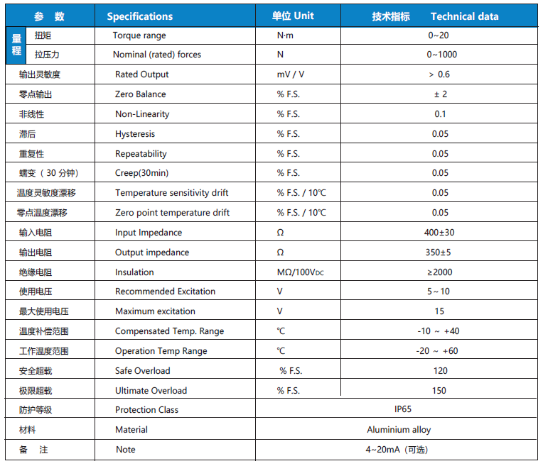 輸出:1mv/V、0~±5/10V、4~20mA可選